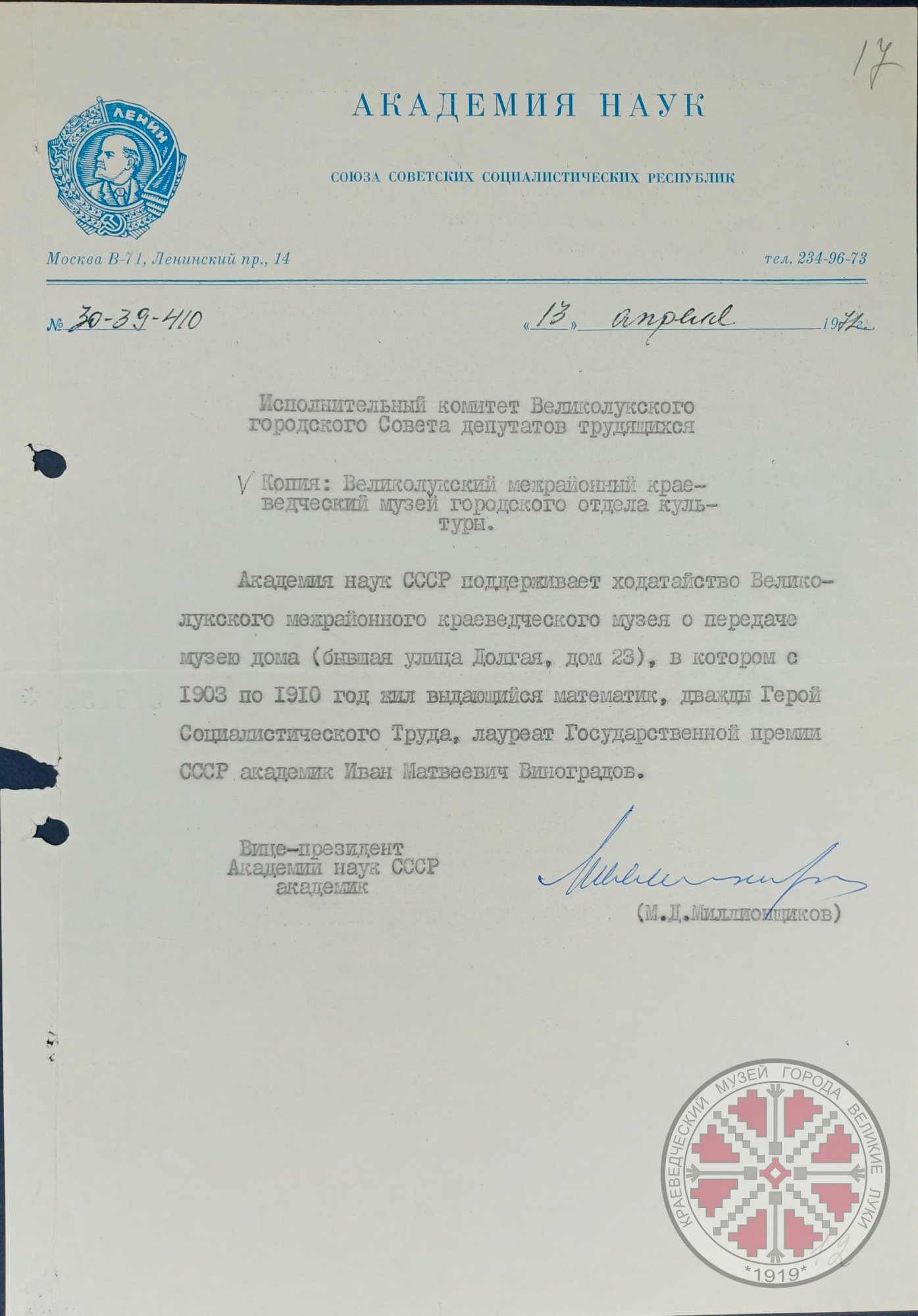 Фото 2. Письмо вице-президента АН СССР ак. Миллионщикова в Исполком г. Великие Луки с поддержкой ходатайства о передаче музею дома, в котором с 1903 по 1910 год жил академик И.М. Виноградов. 13.04.1971 г.