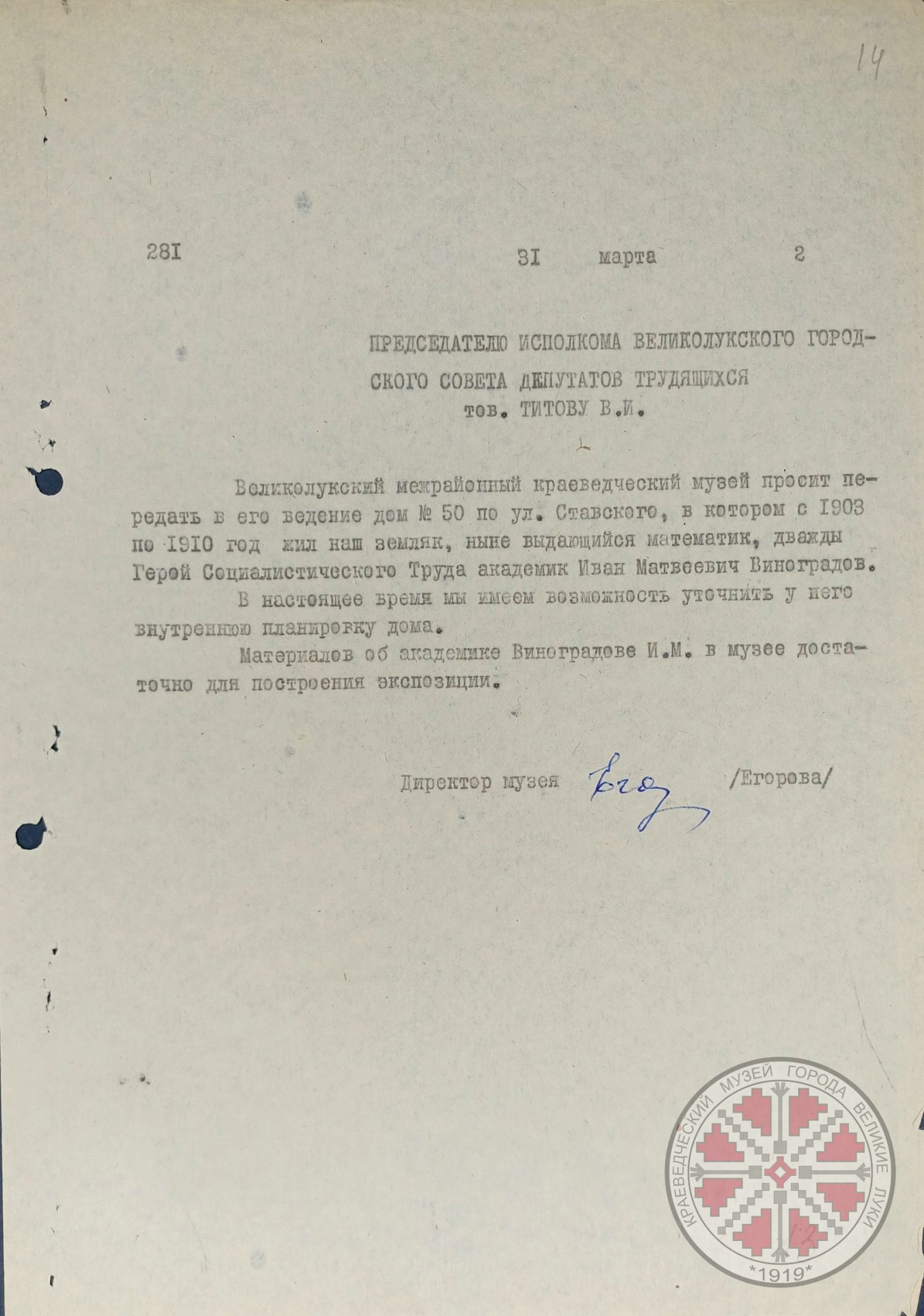 Фото 1. Обращение директора Великолукского межрайонного краеведческого музея Егоровой Н.И. к председателю горисполкома Титову В.И. о передаче в ведение музея дома № 50 по ул. Ставского, в котором с 1903 по 1910 г. жил академик И.М. Виноградов. 31.03. [1970-71 гг.]