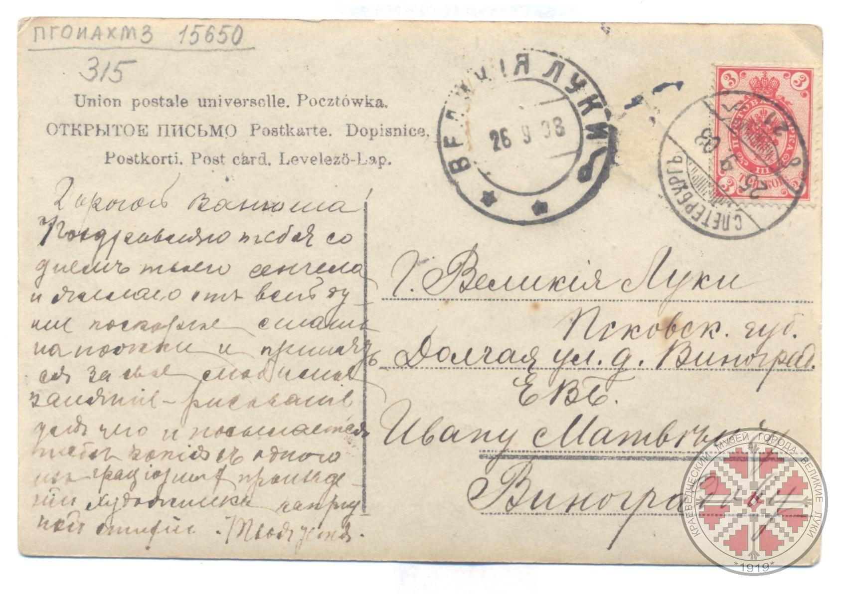 Фото 2. Оборот письма открытого Виноградову И.М., 1908 г.;
