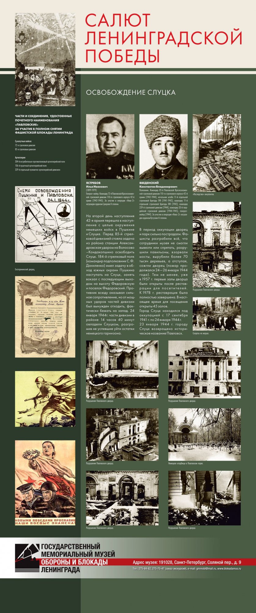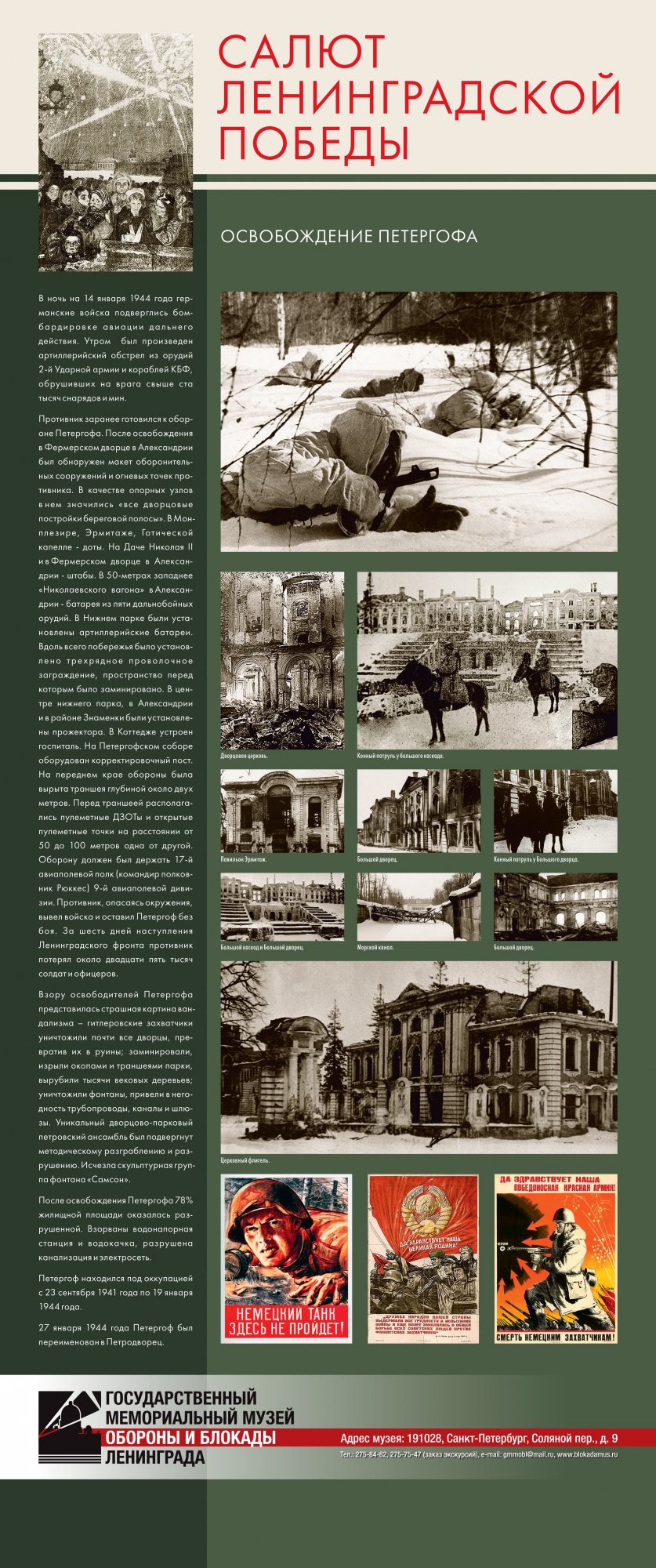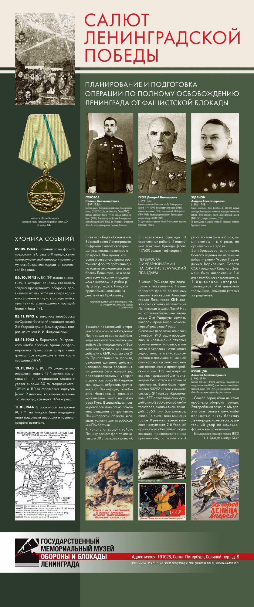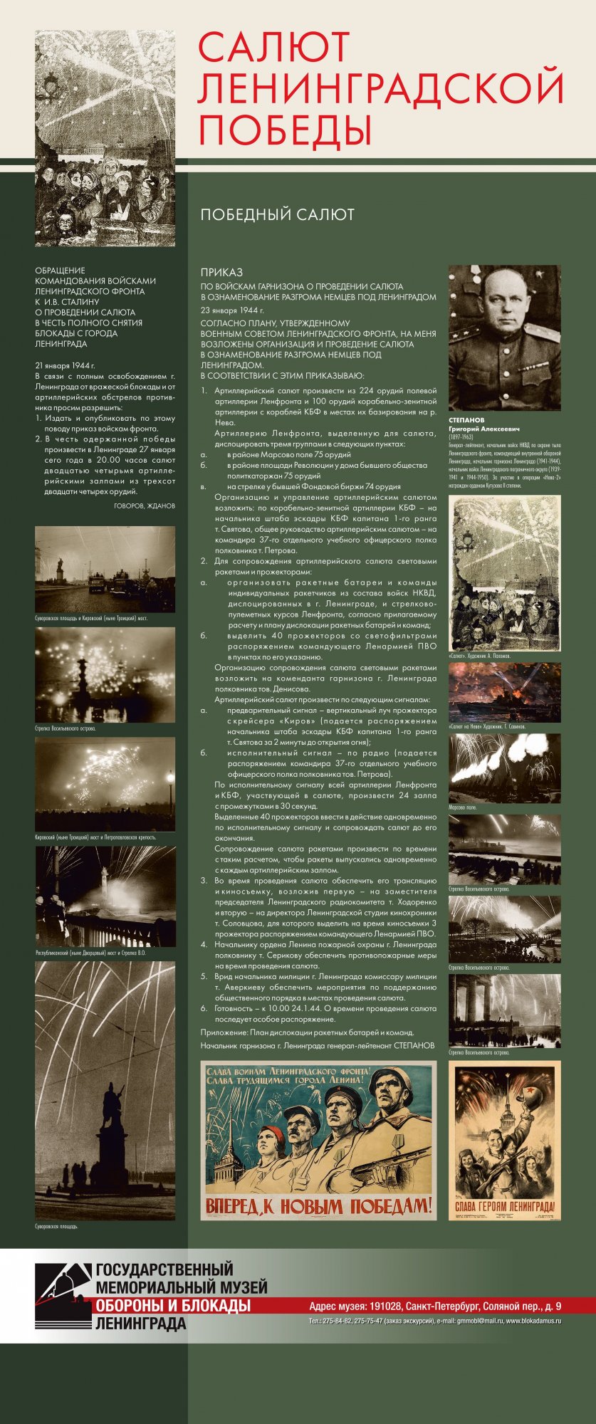 Выставка «Салют Ленинградской победы» предоставлена Музеем обороны и блокады Ленинграда Краеведческому музею города Великие Луки. Их Выставка рассказывает о последнем, решительном наступлении Красной Армии, которое полностью освободило Ленинград от немецко-фашистской блокады. Благодаря выставке можно узнать не только о подготовке операции, роли различных родов войск в полном освобождении Ленинграда от немецко-фашистской блокады, но и проследить ход боевых действий.