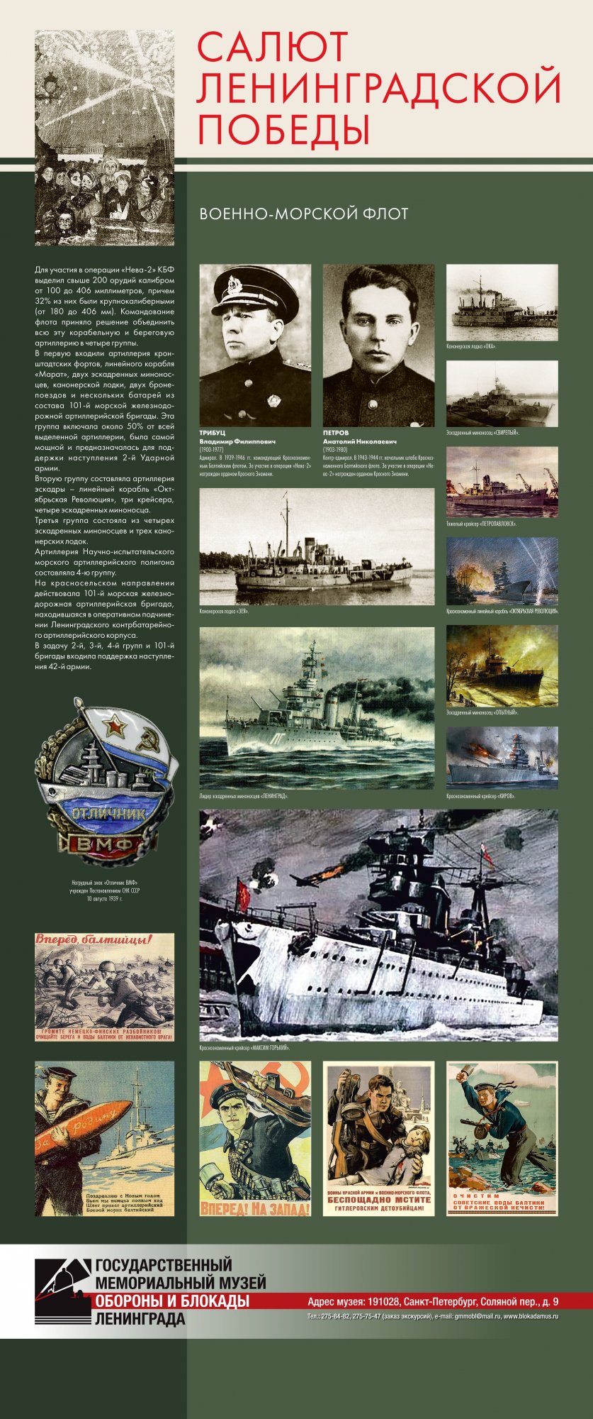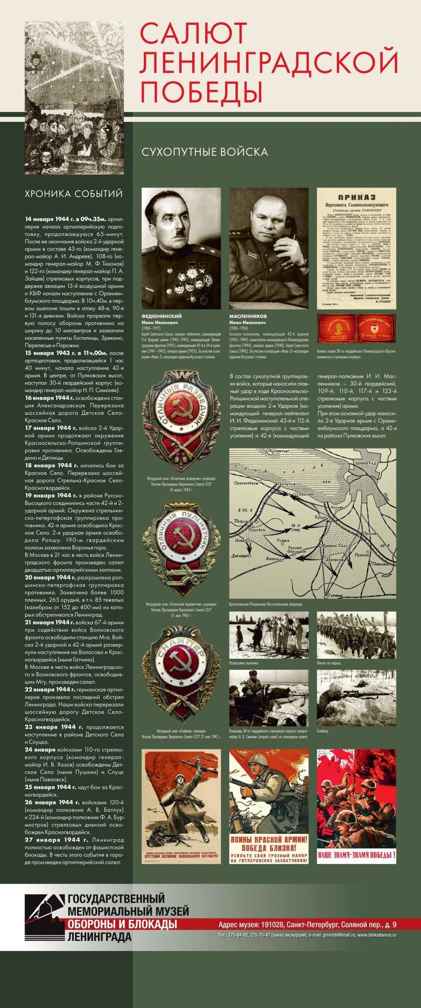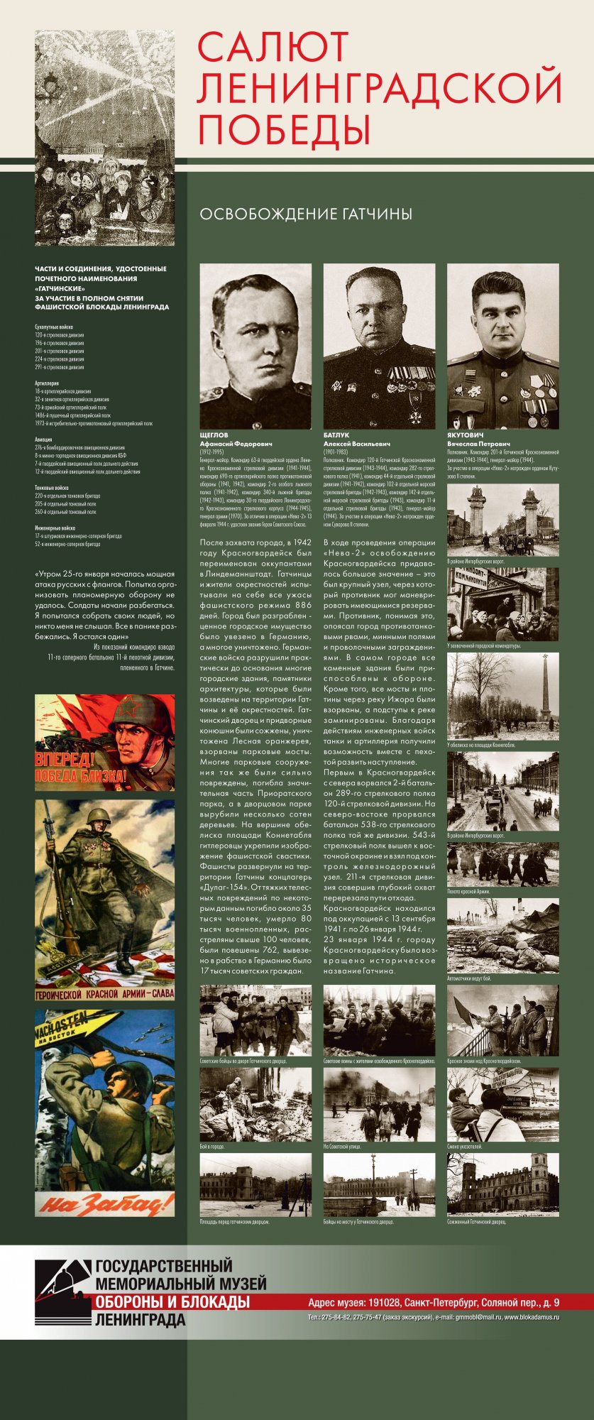 Выставка «Салют Ленинградской победы» предоставлена Музеем обороны и блокады Ленинграда Краеведческому музею города Великие Луки. Их Выставка рассказывает о последнем, решительном наступлении Красной Армии, которое полностью освободило Ленинград от немецко-фашистской блокады. Благодаря выставке можно узнать не только о подготовке операции, роли различных родов войск в полном освобождении Ленинграда от немецко-фашистской блокады, но и проследить ход боевых действий.